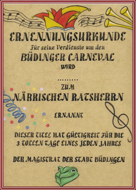 Närrische Ratsherren sind Personen, die den Carneval Club durch ihren Fleiß und Verdienst schon lange Jahre unterstützt haben. Sie werden am Faschingssonntag vom Magistrat der Stadt Büdingen mittels einer Urkunde geehrt, die ihnen symbolisch für die drei tollen Tage eines jeden Jahres überreicht wird, damit sie die Geschicke in unserer Stadt mitbestimmen können.